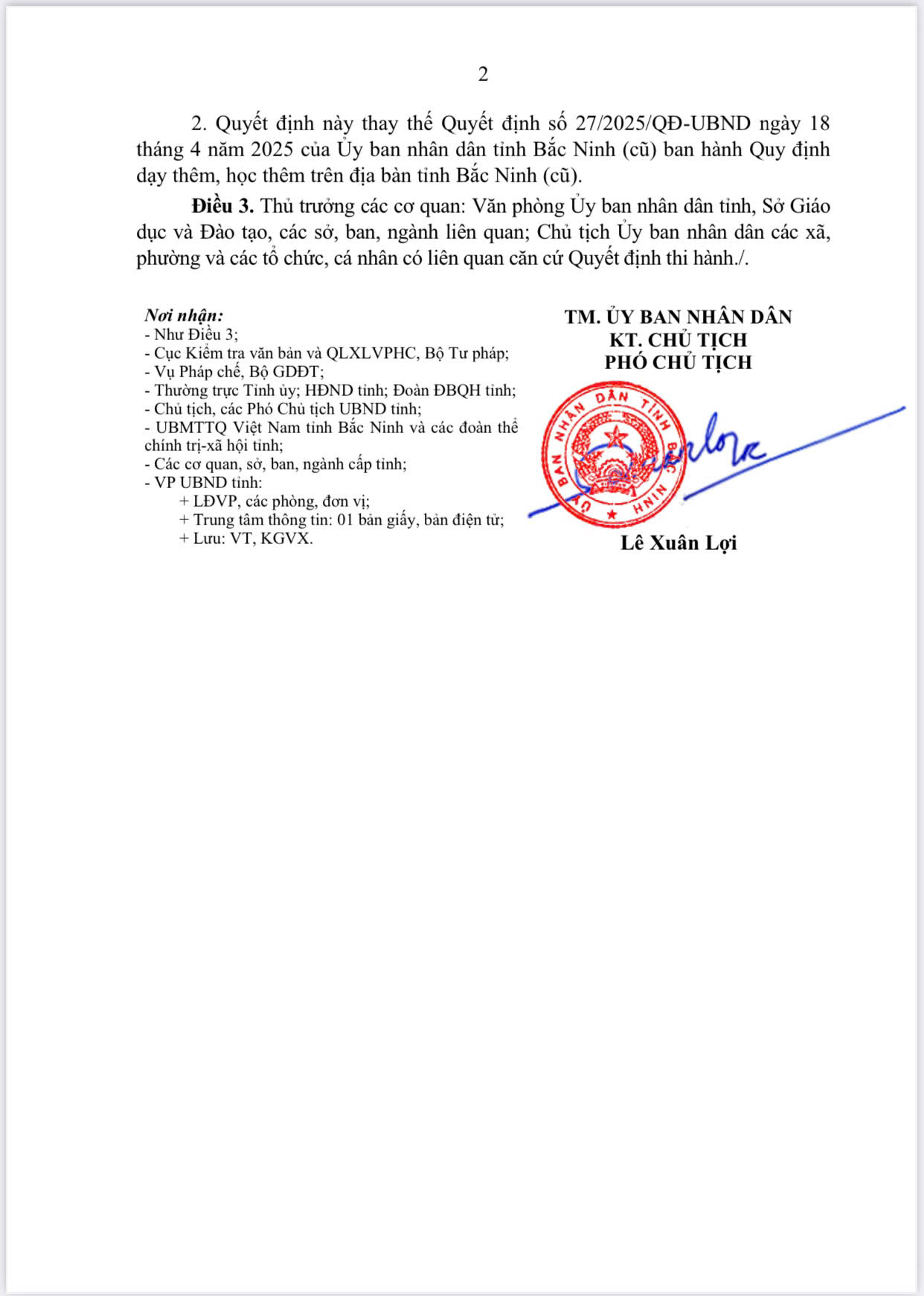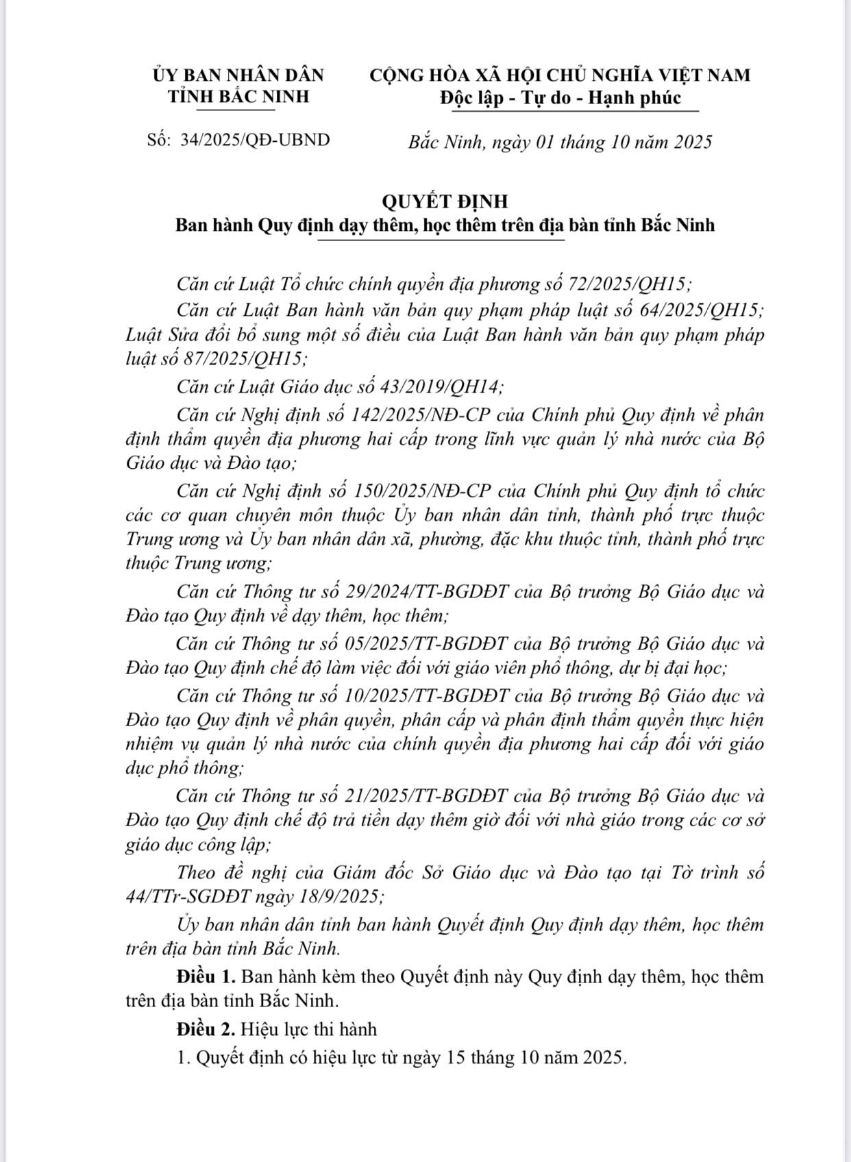 Công văn quyết định ban hành quy chế dạy thêm, học thêm trên địa bàn tỉnh Bắc Ninh