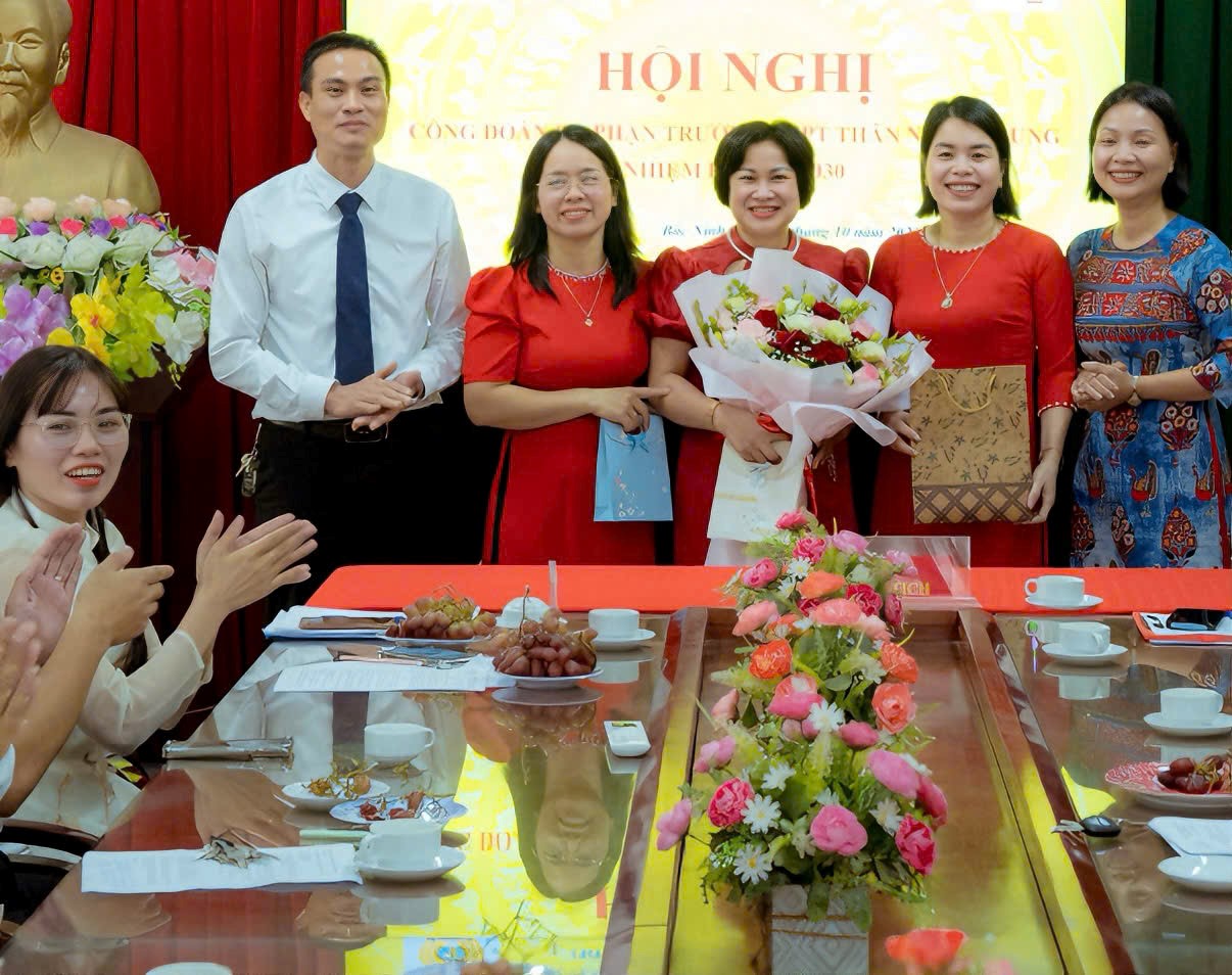 Ảnh: Đại diện thầy cô và nhà trường tặng hoa và chúc mừng Ban chấp hành công đoàn mới nhiệm kỳ 2025 – 20230