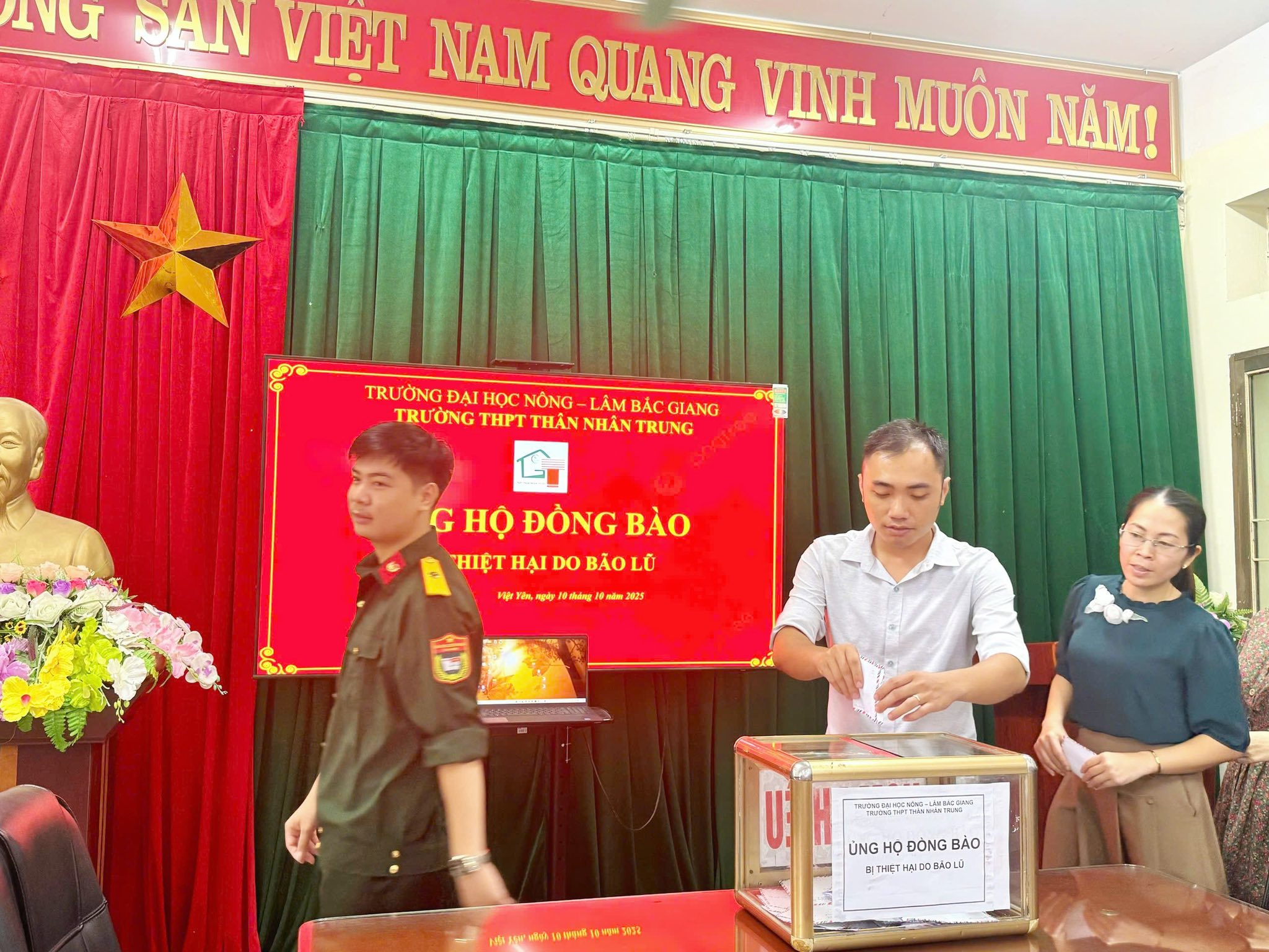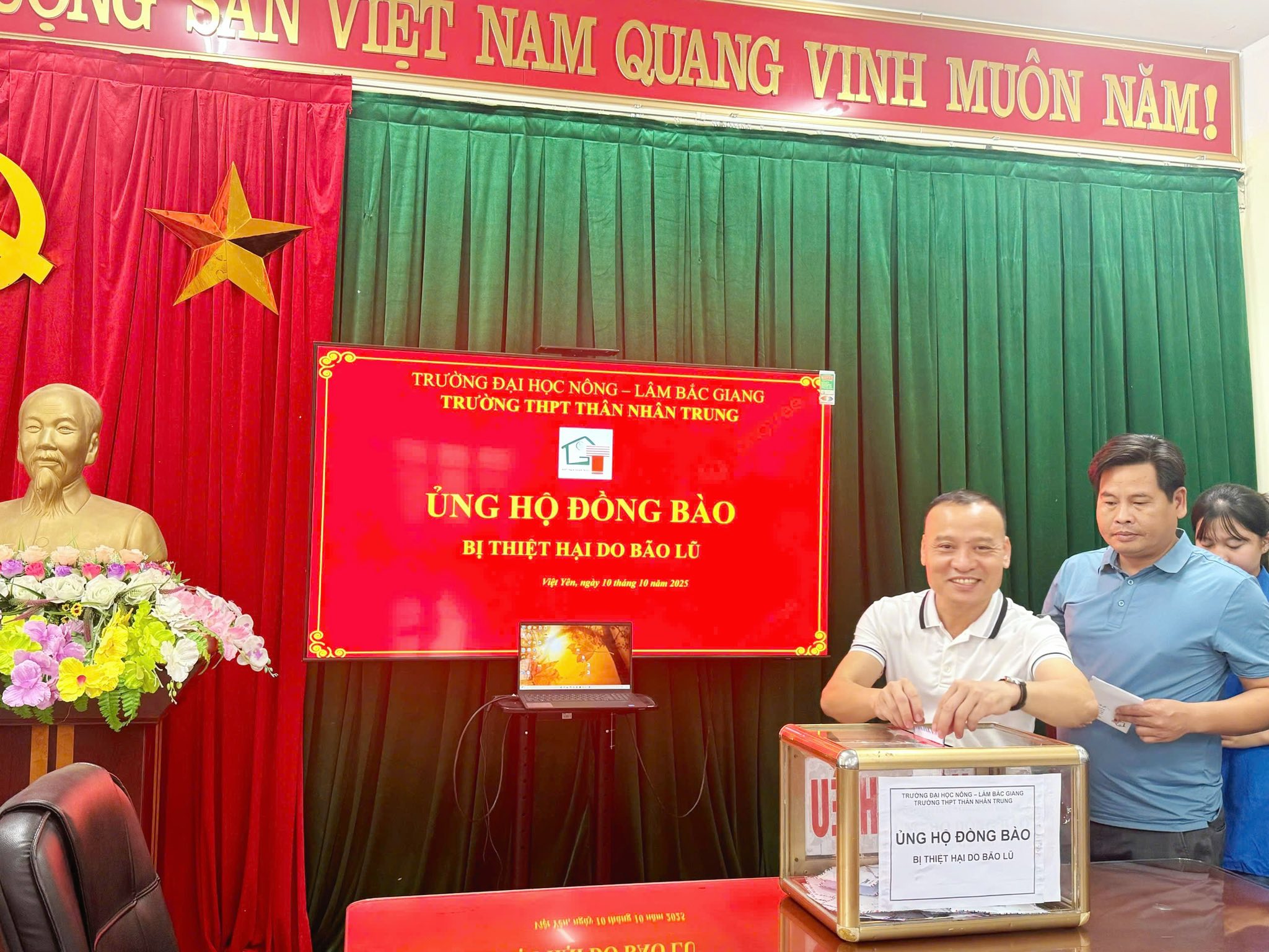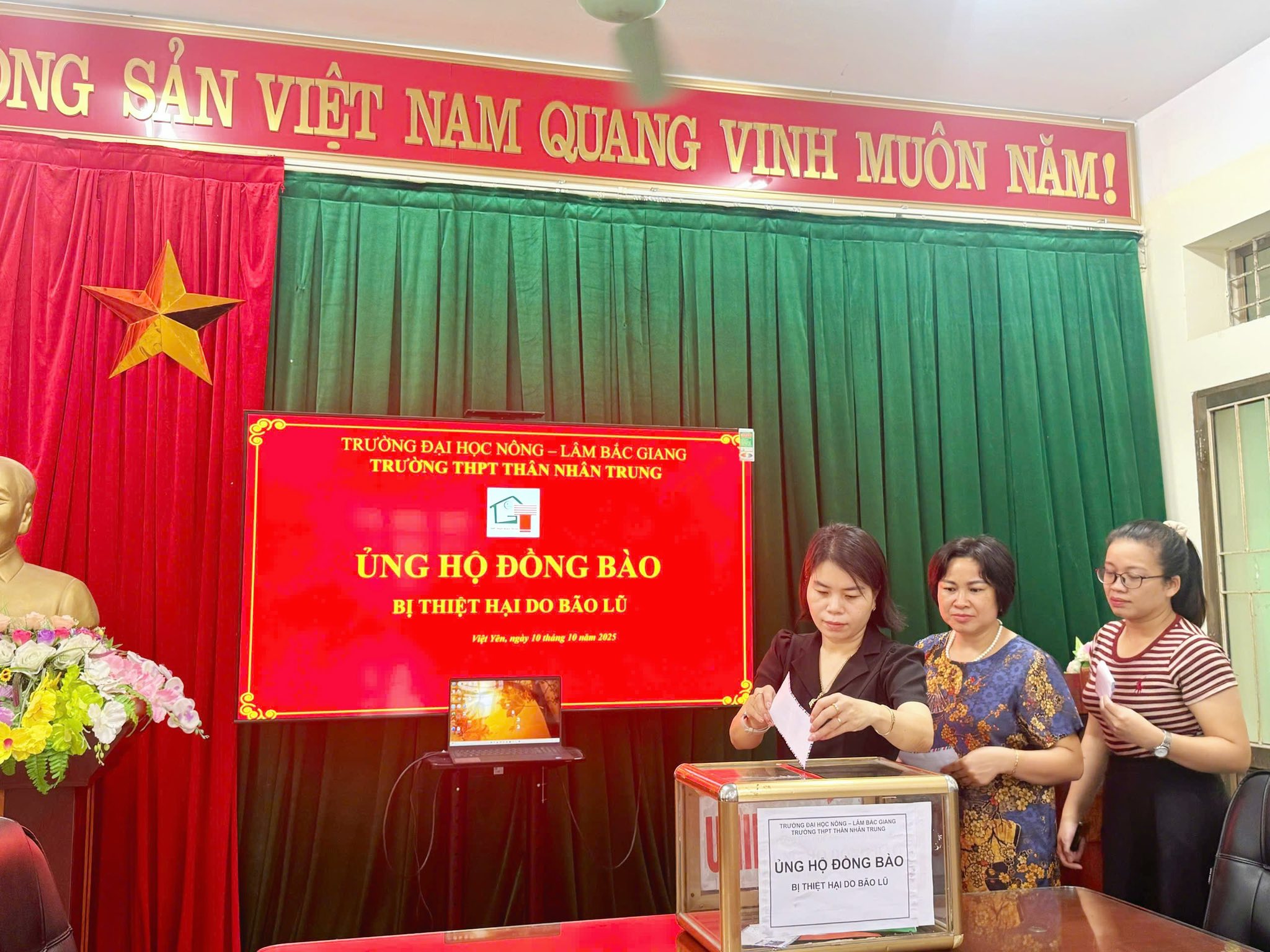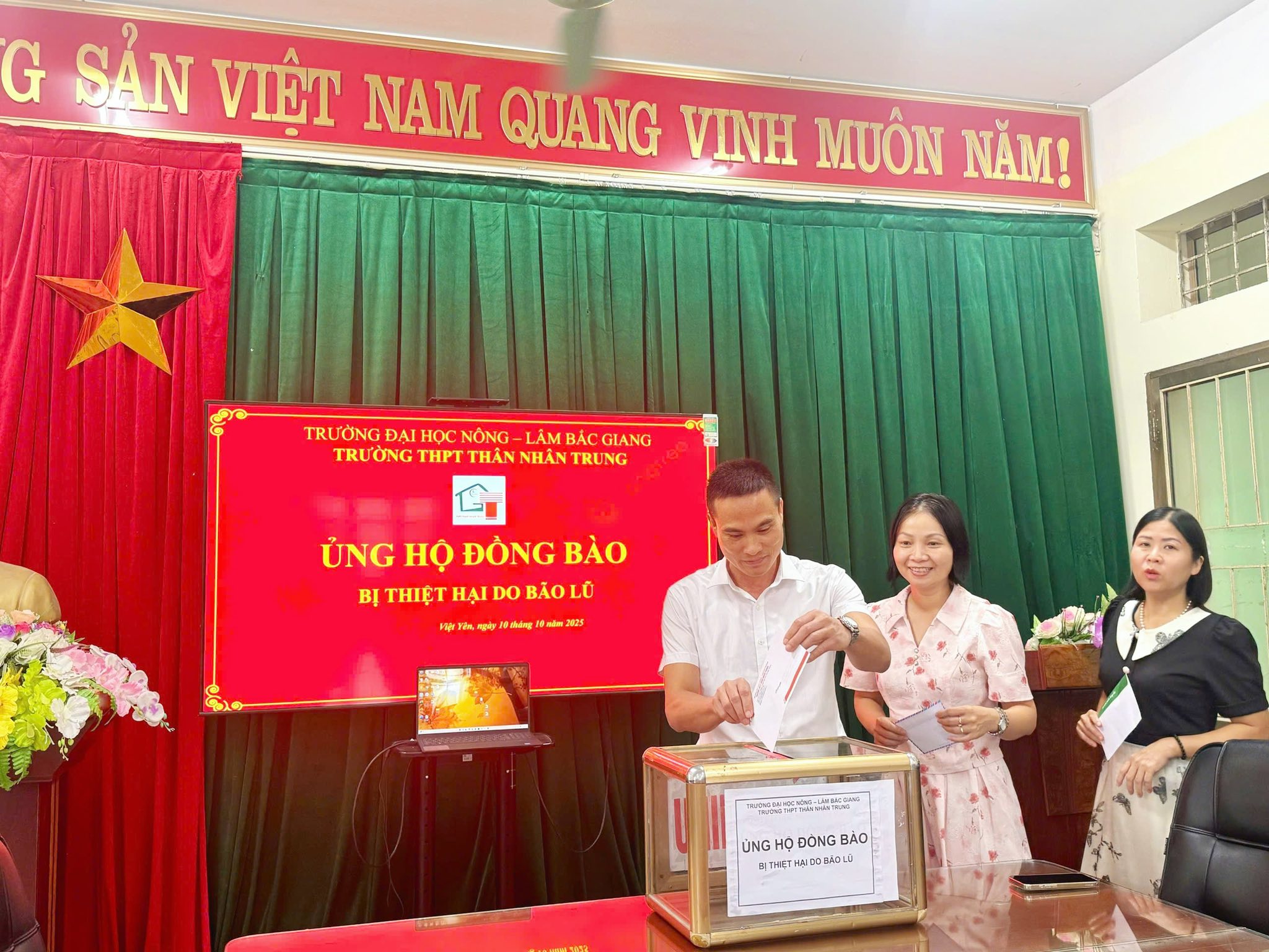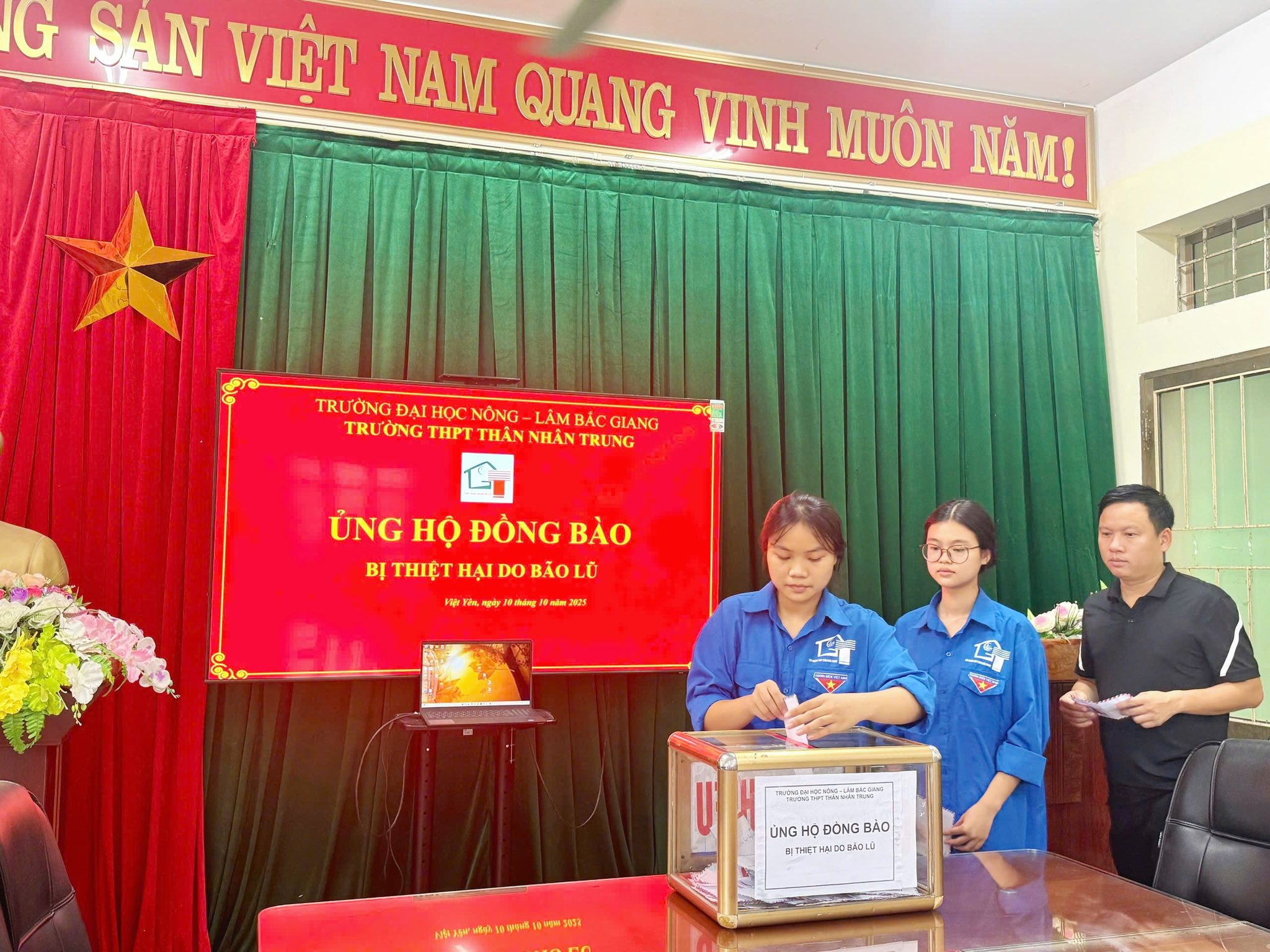 Trong những ngày vừa qua, do ảnh hưởng của mưa lớn kéo dài, nhiều tỉnh miền Bắc đã chịu thiệt hại nặng nề về người và tài sản. Hưởng ứng lời kêu gọi của Ủy ban Mặt trận Tổ quốc Việt Nam và Sở Giáo dục và Đào tạo tỉnh Bắc Ninh, tập thể cán bộ, giáo viên và học sinh Trường THPT Thân Nhân Trung, phường Việt Yên, tỉnh Bắc Ninh đã phát động phong trào “Hướng về miền Bắc thân yêu – Chung tay vì đồng bào vùng lũ” nhằm quyên góp, ủng hộ những người dân đang gặp khó khăn.